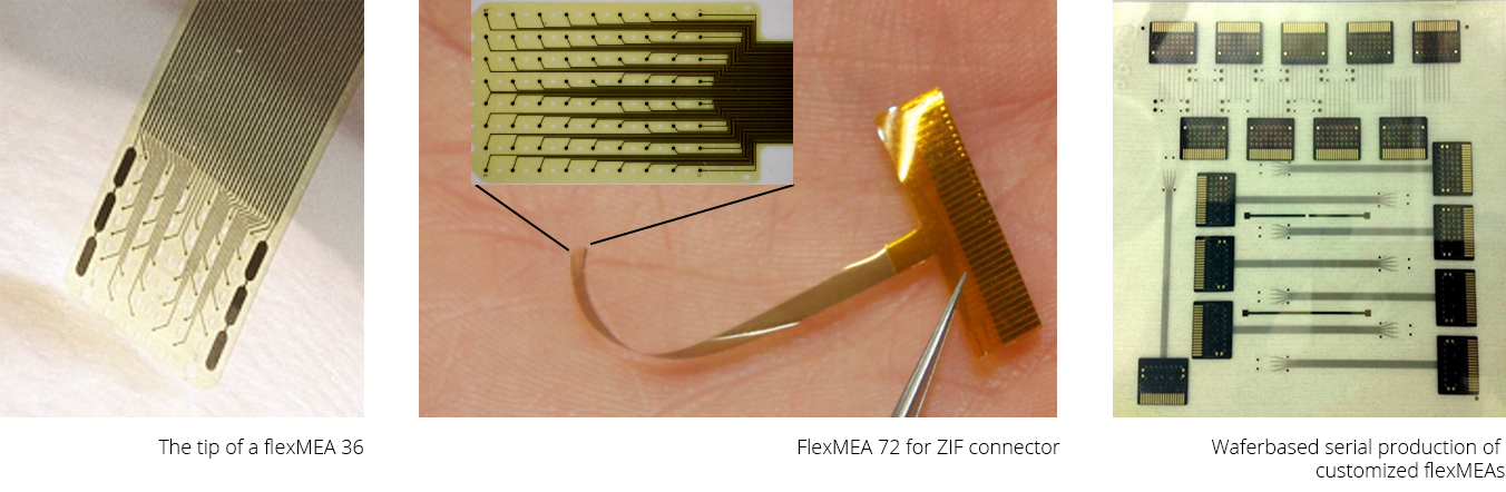 These flexible, ultrathin (12 µm) microelectrode arrays are fabricated from polyimide foil and metal thin films. They are ideal for in vivo/ex vivo experiments and specific in vitro applications. FlexMEAs can be easily attached to the surface of heart and brain tissue.